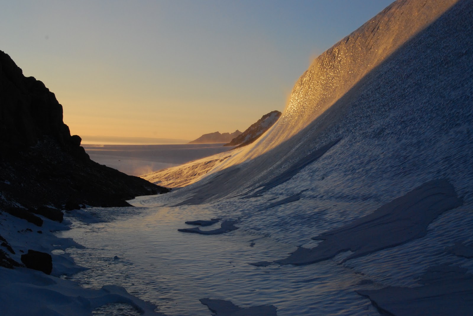The plan today was to check out a few wind scours we had driven passed yesterday and just to explore a bit more around the Central Masson Range. Our first stop was at the base of Ferguson Peak. (900m) We followed the wind scour in an anti clockwise direction which was very spectacular yet bitterly cold. There was bliz drifting along the ice and the whole ground looked like it was moving. The further south we went the stronger the wind got as it funnelled through the scour making conditions quite extreme for us.